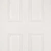Two clear glazed panels are positioned above two raised shaped panels, with raised moulding on both sides and a white composite.